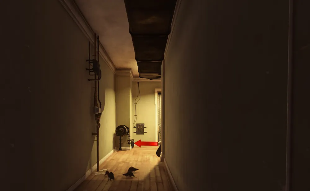 Если же ключа у вас с собой нет, но вы в свое время не стали отказываться от дара Чужого, то сейчас самое время задействовать Вселение для Корво или улучшенную Легкую тень для Эмили. Дело в том, что рядом с входом в квартиру есть технический лаз, коим я и предлагаю воспользоваться. Крыски для вселения весьма кстати тусуются поблизости.