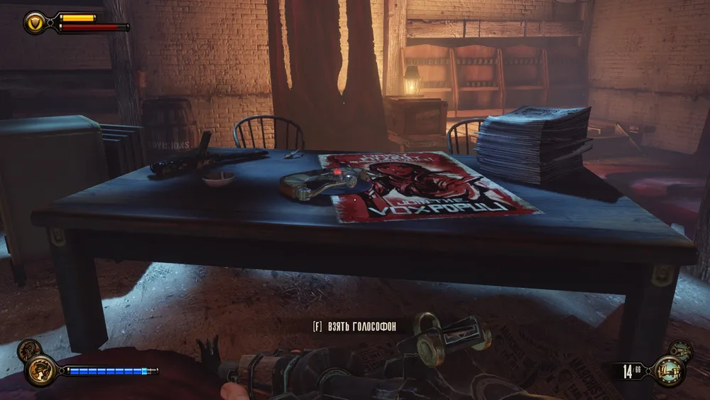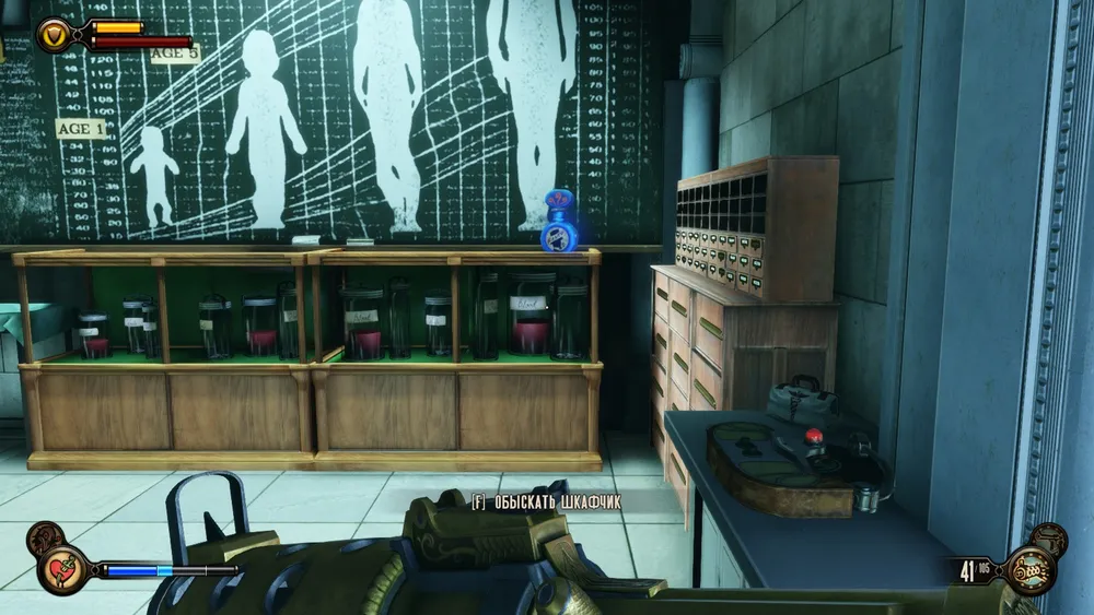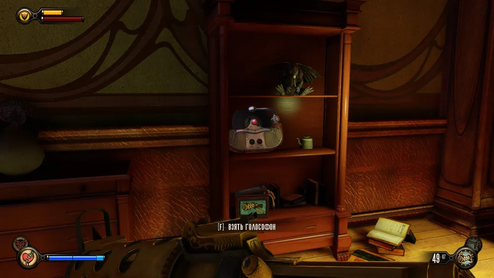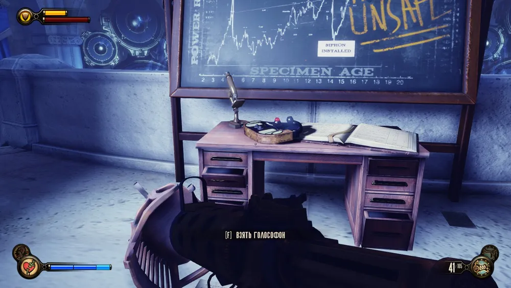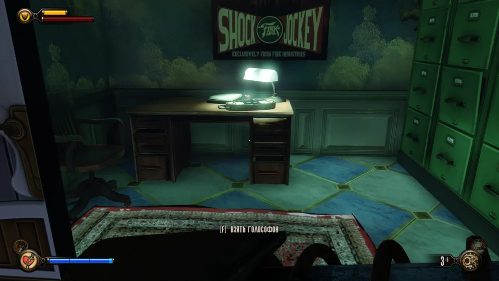 Проходим в люк, и в комнате, где напротив входа будет еще одна таблица роста, справа на столике можно будет взять голософон.