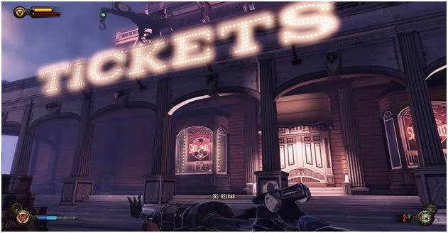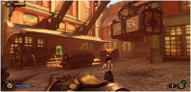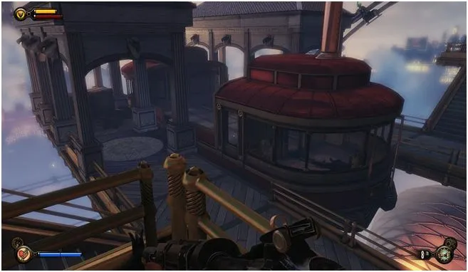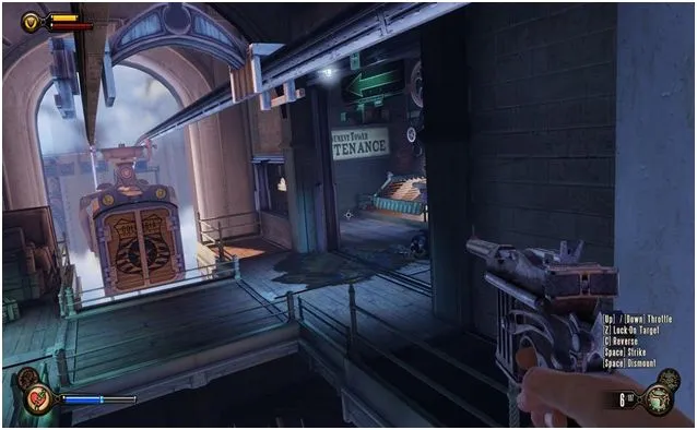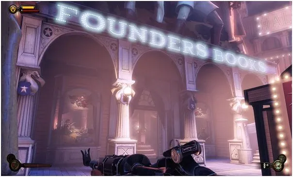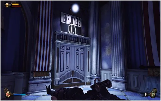 Уже пройдя за статую леди Комсток, идем под арки и открыв дверь, около статуи, подкрадывающейся Фицрой, сворачиваем направо
