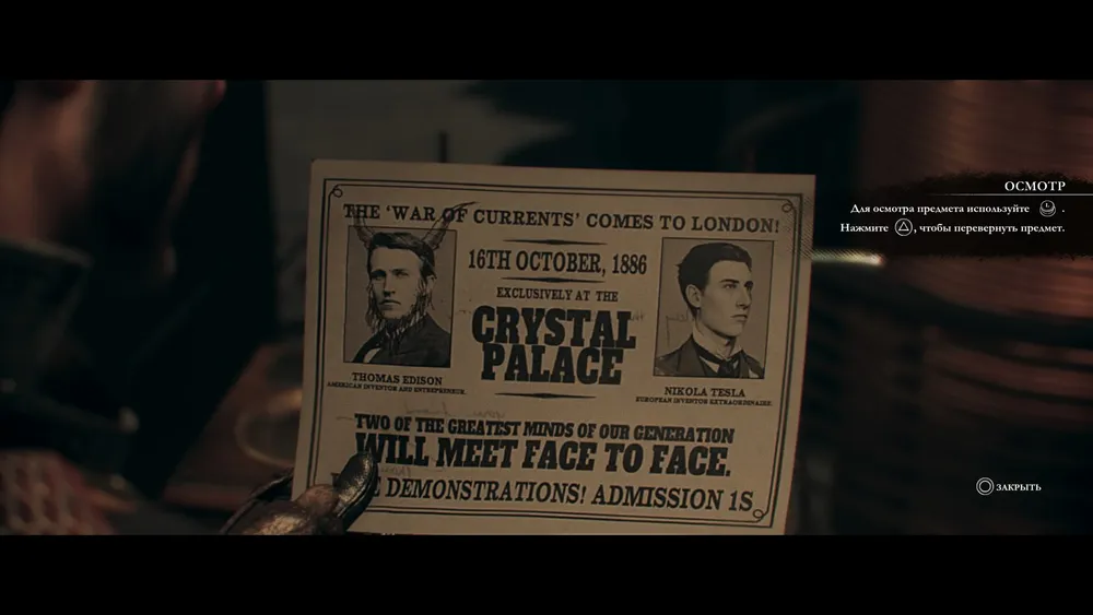 1. Документ. На столе справа от входа лежит рекламная листовка публичной встречи Николы и его научного конкурента Томаса Эдисона. Считайте, что это не только внутриигровой документ, но и пасхалка. Великие ученые, в чем-то они, как дети. :)))
