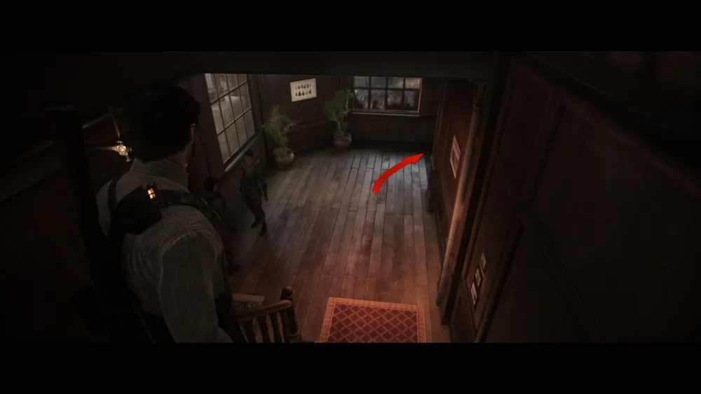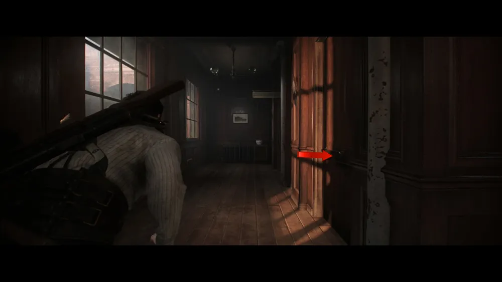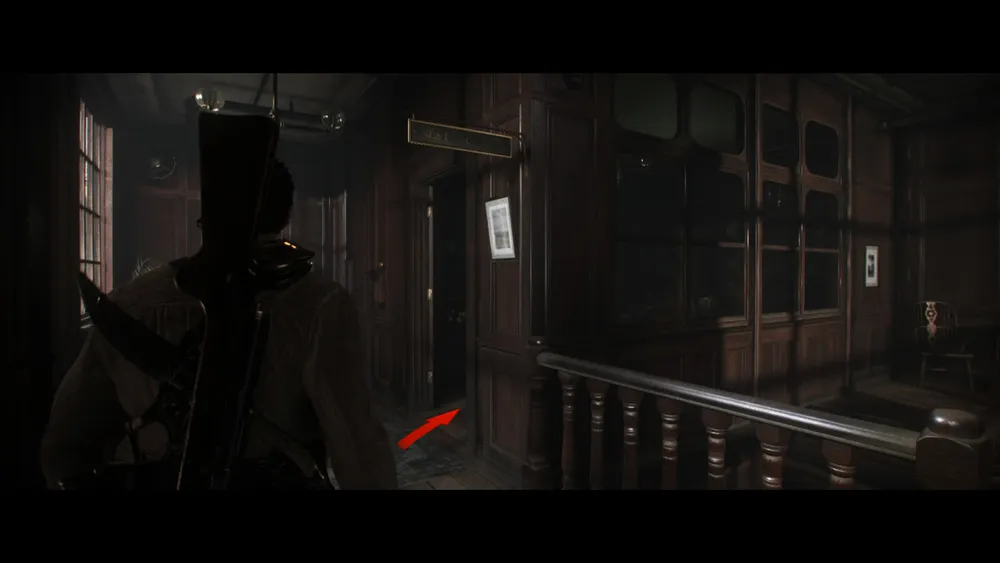 7. Фотография. После долгой катсцены оказываемся в здании портовой конторы. Поднимаемся на второй этаж. Нам нужно попасть в офис возле лестницы. Там у дальней стены, на тумбочке между двумя книжными шкафами лежит фото слона-тяжеловоза.