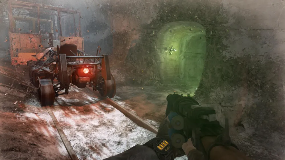 Определенный промежуток рельс, по которым двигается ваша дрезина, будет затоплен радиоактивными отходами – это место вы навряд ли пропустите, так как ваш счетчик Гейгера начнет издавать характерный звук.