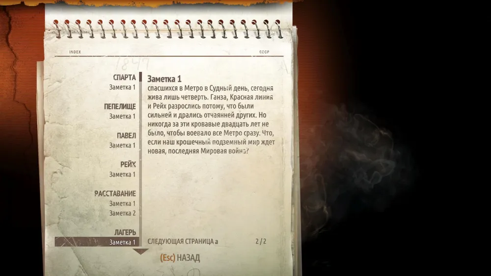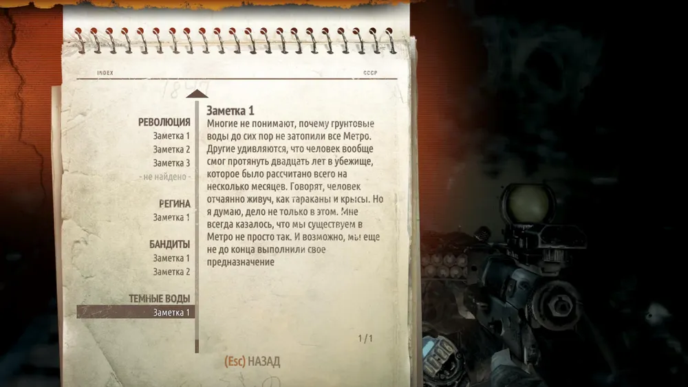 Думается, играя в Metro: Last Light, вы то и дело натыкались на записи из дневника Артема, достаточно подробно раскрывающие не только тонкости основного сюжета игры, но и подробности о вселенной игры. Собирать эти записки – занятие довольно увлекательное и непростое, ибо записок аш 43 штуки и, бывает, валяются они в самых малоприметных местах.