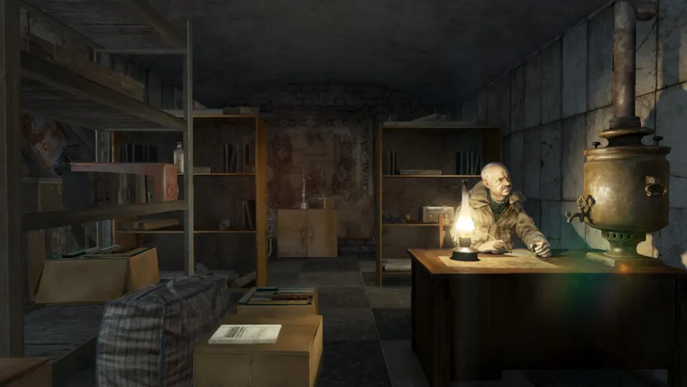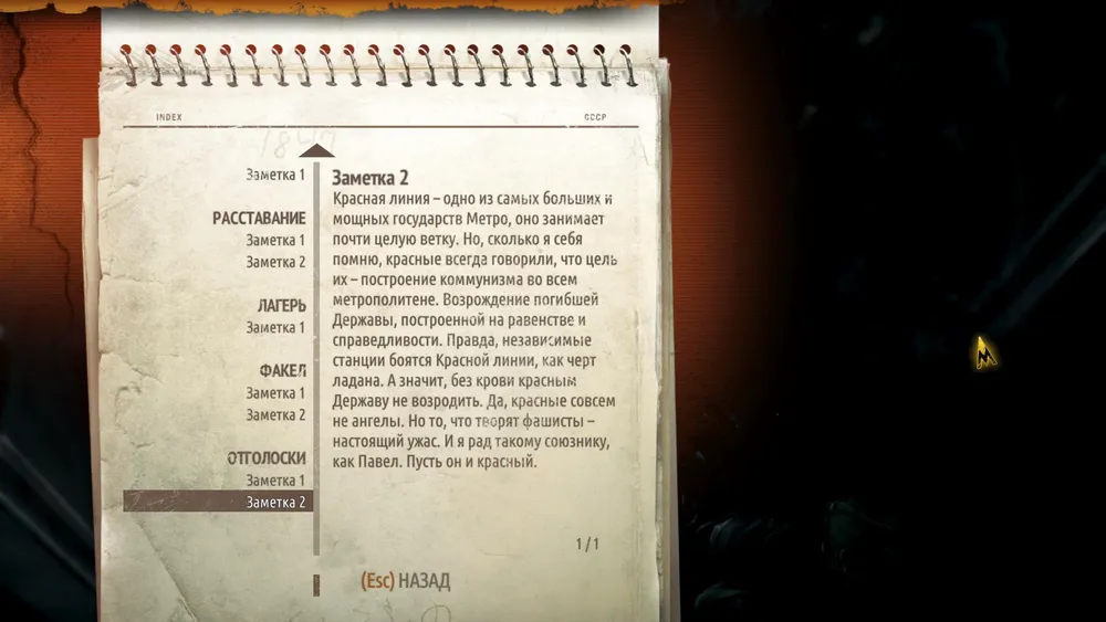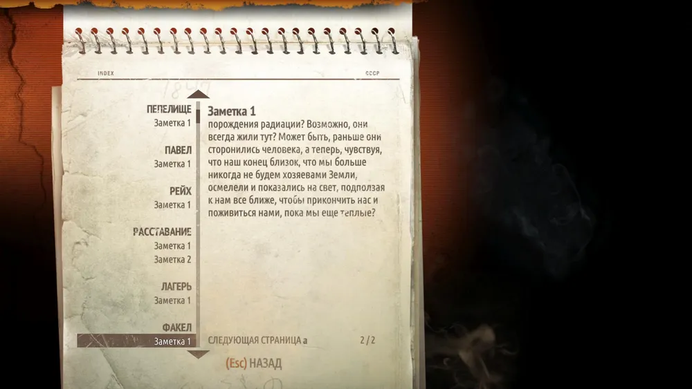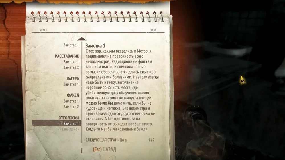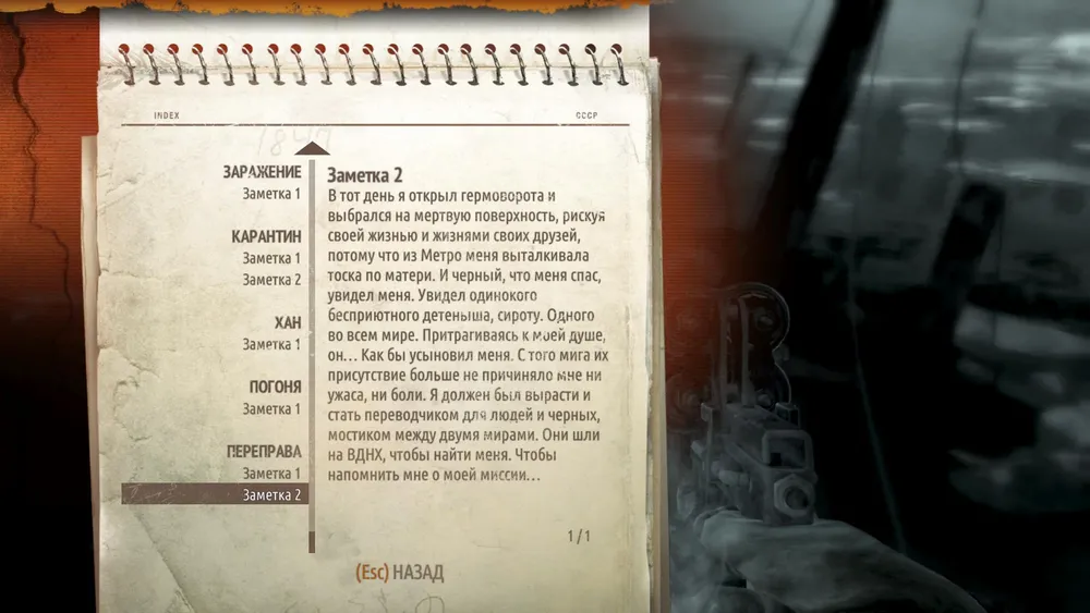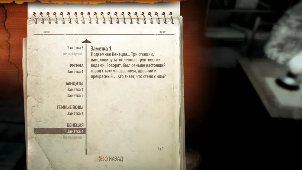 Первую тетрадку вы можете обнаружить в самом начале уровня: в комнате, где Павел найдет противогазы. Тетрадка лежит на барной стойке.