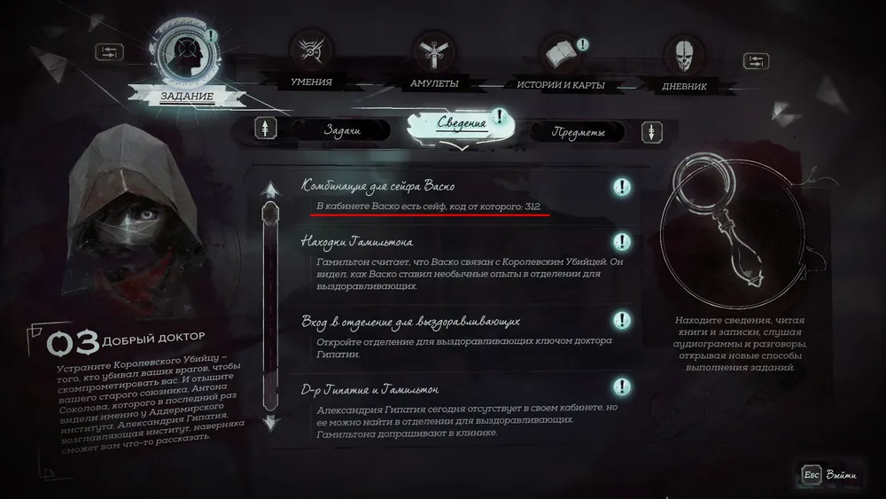 Прежде чем докторша обернется сумасшедшей убийцей и накинется на Васко, тот успеет сообщить Корво или Эмили код от своего сейфа, и соответствующая запись появится в Журнале, во вкладке Сведения.