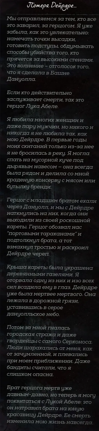Интересно. Понять, что же такого памятного в этой газели, поможет аудиограф с записью «Потеря Дейрдре» из капитанской рубки «Падшего дома». Он появится там в начале восьмой главы, перед вылазкой в Дворцовый квартал.