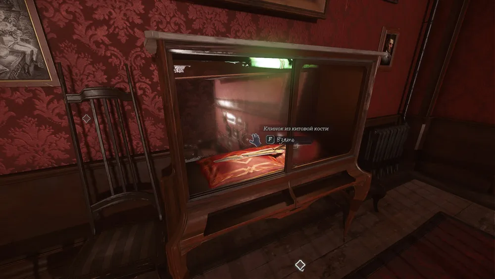 Тайник найти несложно – на него укажет участок кирпичной кладки с отвалившейся краской. Кстати, если вы играете за Корво, он сам подскажет поискать тайник. Помимо приза там еще лежит китовая кость.