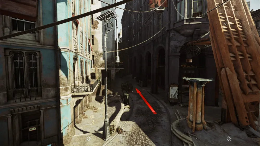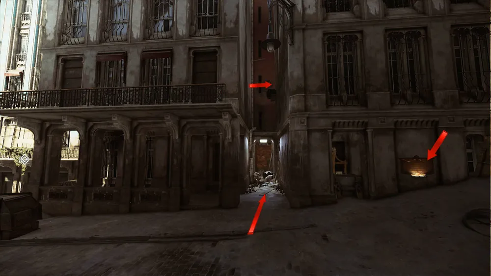 На доме напротив форпоста, примыкающем к наглухо перекрывающей переулок стене, есть мемориальная табличка, мол, тут некогда жил Корво Аттано, ставший лордом-защитником в 1817 г. Вход в подъезд замурован, но попасть в бывшую квартиру семейства Аттано возможно. Для этого воспользуемся тупичком перед домом и по карнизам и воздуховодам телепортируемся к заколоченному досками окну.