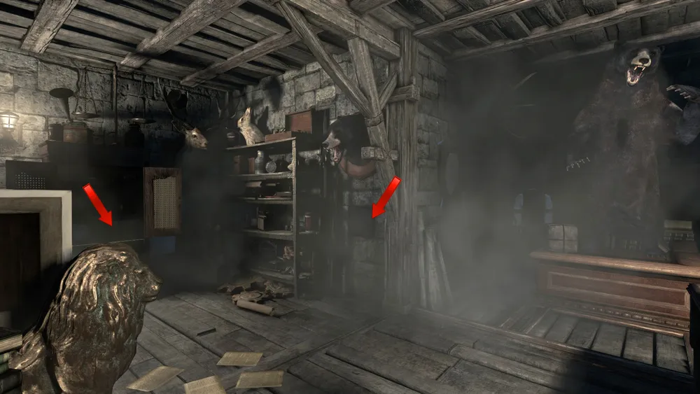 3. Камея "Целомудренная леди" (Наставления Уайтридж) находится в подвальной части хранилища, в сундуке. Проникнуть туда можно, если в самом хранилище найти и нажать секретную кнопку (ищите ее под охотничьим трофеем - головой медведя). После нажатия кнопки чучело медведя отъедет назад, и откроется лестница, ведущая вниз.