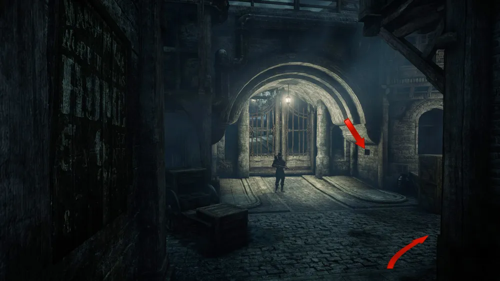 1. Мемориальная доска "Шлюз Южного квартала" (Мемориальные доски) прикручена к стене дома в Вонючем переулке (такая же грязная и заляпанная, надо думать, как тот закоулок, в котором наш герой ее найдет). Как только пьянчужка Ленни остановится поболтать с местной шлюхой, Гаррет получит толику свободного времени, чтобы завернуть в ближайшую подворотню и отвинтить доску. Подворотня находится аккурат за спиной алкаша.