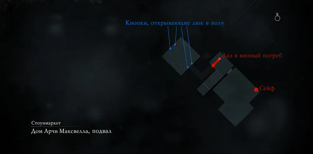 Сперва через вентиляционный лаз перебираемся из подвала с сейфом, где и находилась шахматная фигура, в винный погреб. Казалось бы, дальше пути нет. Однако не все так просто. В погребе под потолком есть четыре кнопки, нажатие которых откроет люк в полу и позволит Гаррету проникнуть еще глубже. Кнопки расположены за укосами, поддерживающими потолочные балки: две над дверью и две над входом в вентиляционный канал, откуда мы только что приползли. Местоположения кнопок проще всего выяснить посредством концентрации. Для их нажатия используйте лук и тупые стрелы. Как только все кнопки будут активированы, под потолком появится балка, куда можно будет пристрелиться канатной стрелой, а в полу откроется глубоооокий такой колодец. Спускаемся.