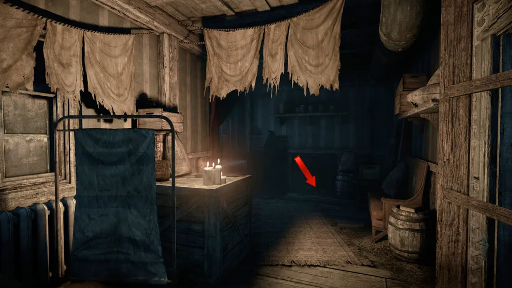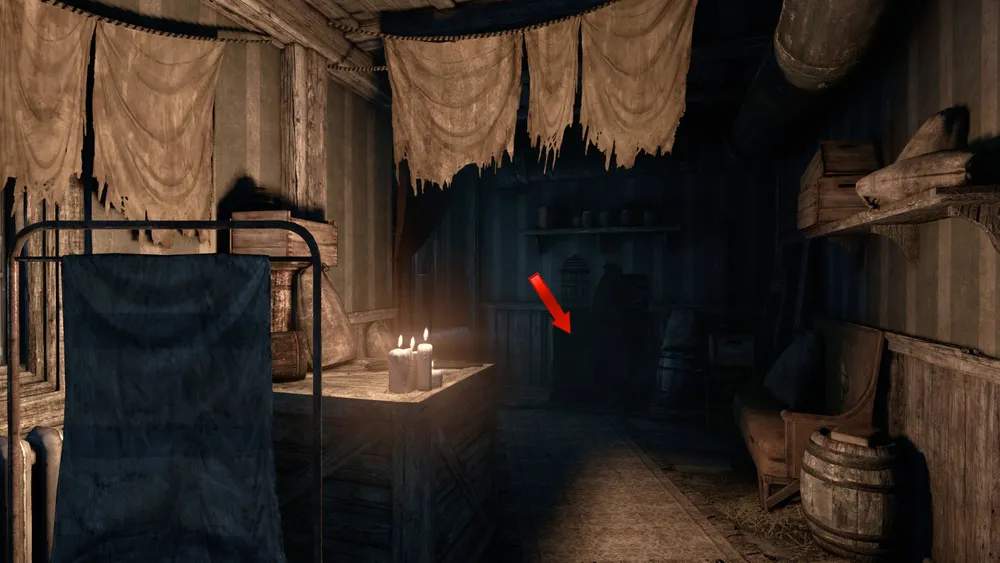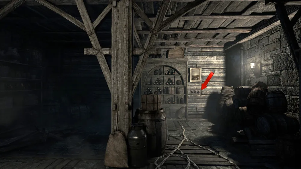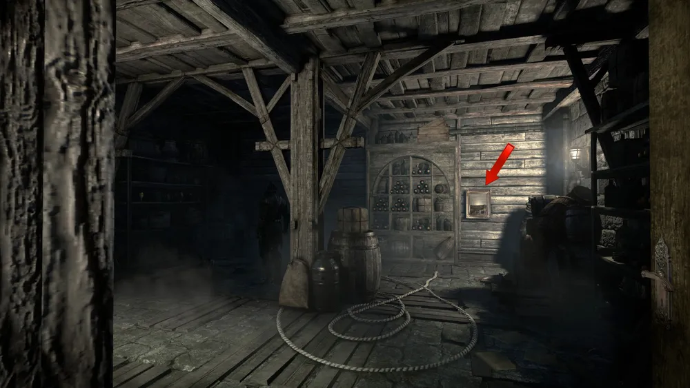 Спускаемся в подвал. Там за грудой бочек будет лаз, который окончится маленьким темный помещением с двумя бочками. На одной из них будет кнопка. Нажимаем ее, и нам откроется та самая потайная комнатка, где висит картина.