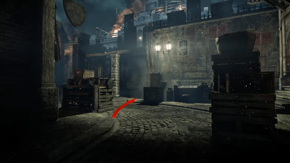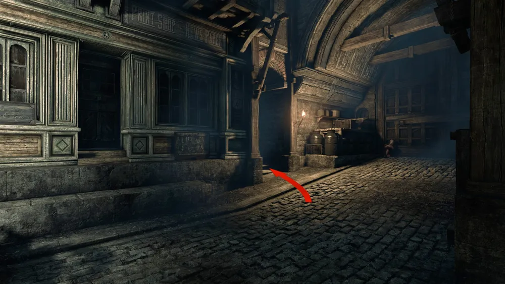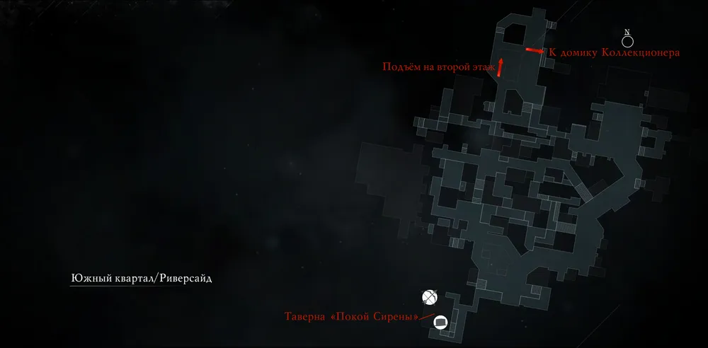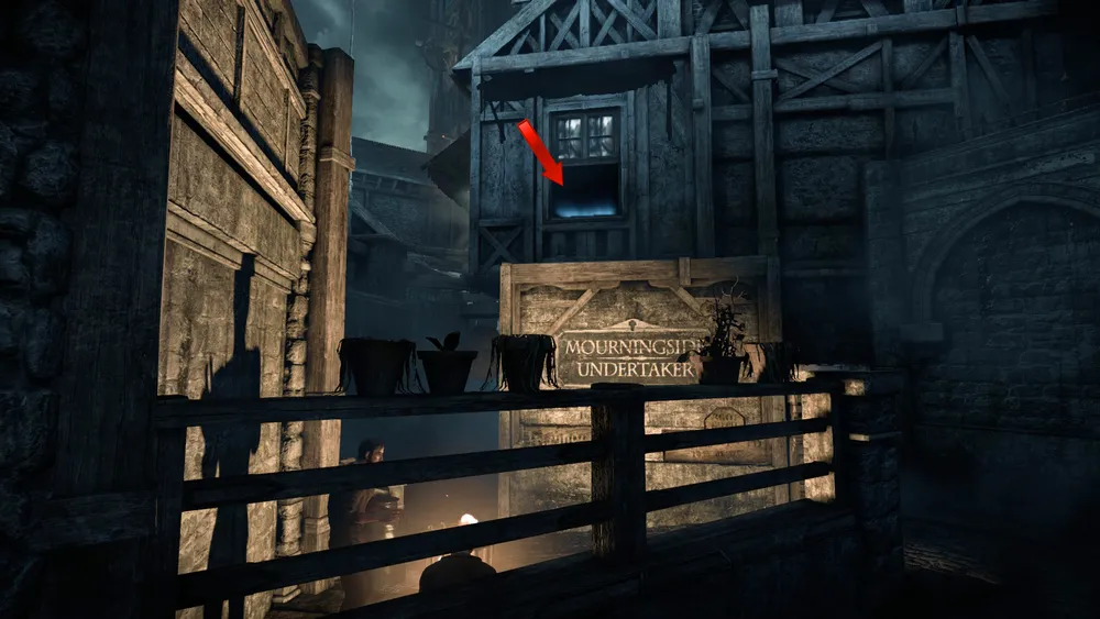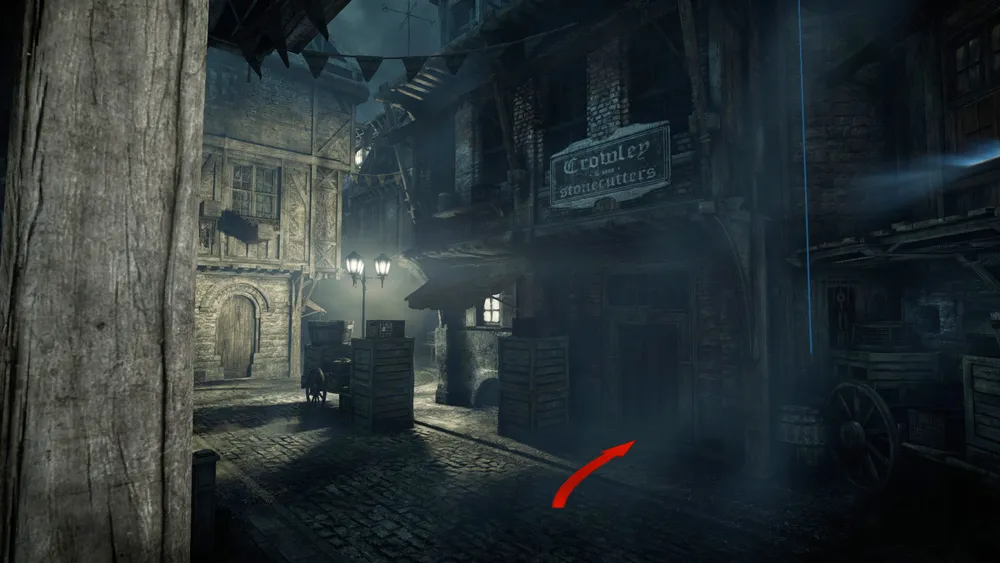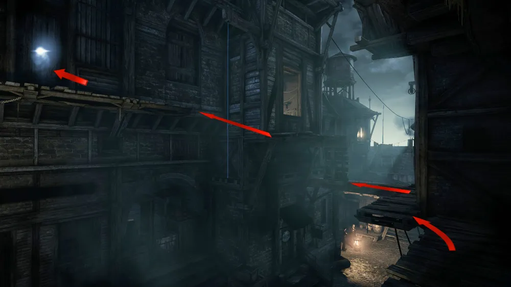 Пробираться в переулок, где расположился домик Коллекционера, мы будем через окно второго этажа строения, выходящего на Проспект Барона. Забраться наверх можно со двора дома напротив, а потом через комнаты в нем, перекинутую через улицу балку и систему карнизов добраться до нужного окна не составит труда.