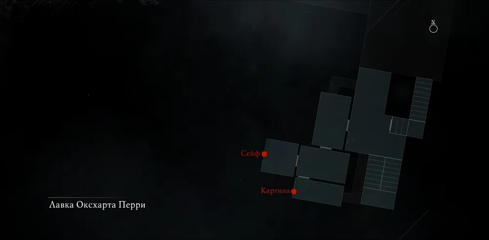 Начинать собирать ценные трофеи, хранящиеся в доме Оксхарта Перри, лучше всего с его личной спальни на втором этаже, ибо именно там находится распределительная коробка, позволяющая отключить систему защиты сейфа, где хранится голосовой аппарат. Заглянув к хозяину лавки на огонек, Гаррет сможет унести с собой на память три коллекционных предмета.