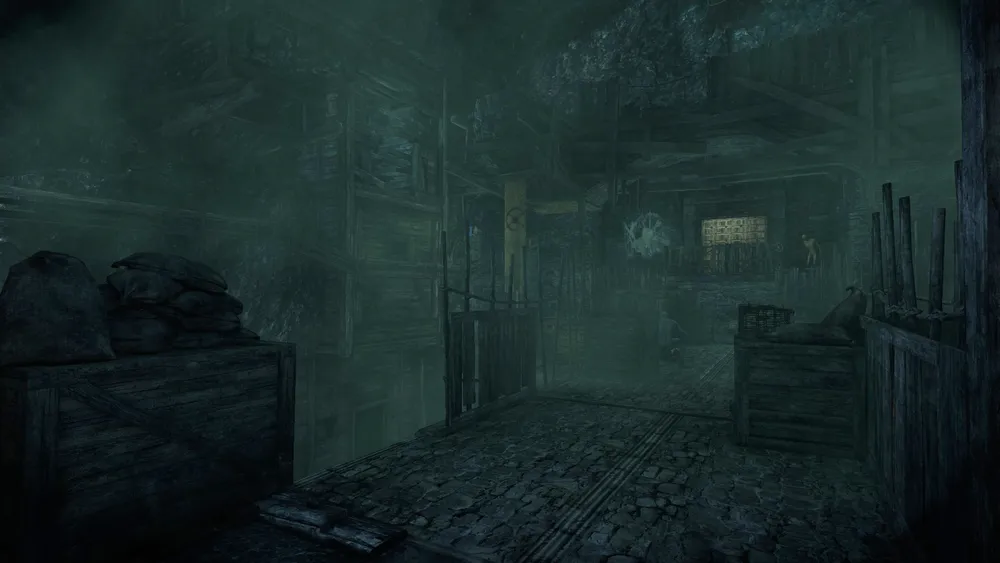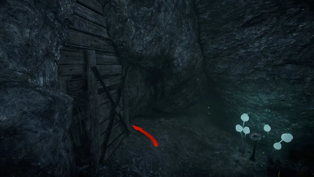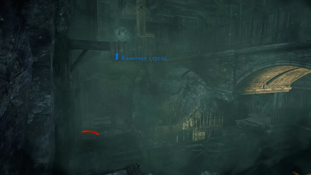 Как только окажемся в пещере, где пасутся уродцы, сворачиваем налево, вниз по лестнице. Дойдя до обрыва, пристреливаем к балке сверху канат и преодолеваем обрыв. Слева будет деревянное строение типа сарай. Взламываем замок и заходим.