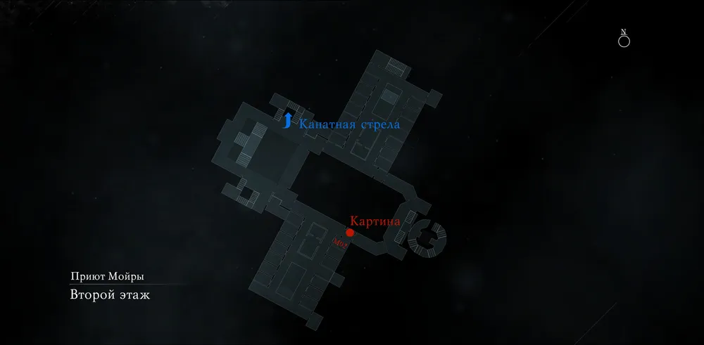 Оказавшись в блоке с палатами мужского отделения, движемся прямо по коридору, никуда не сворачивая, до темного тамбура. В тамбуре на левой по ходу движения стене будет висеть пустая рама. Это и есть наш шедевр, пока еще недоступный. Чтобы полотно появилось, Гаррету придется заглянуть в соседнюю с тамбуром палату М02.