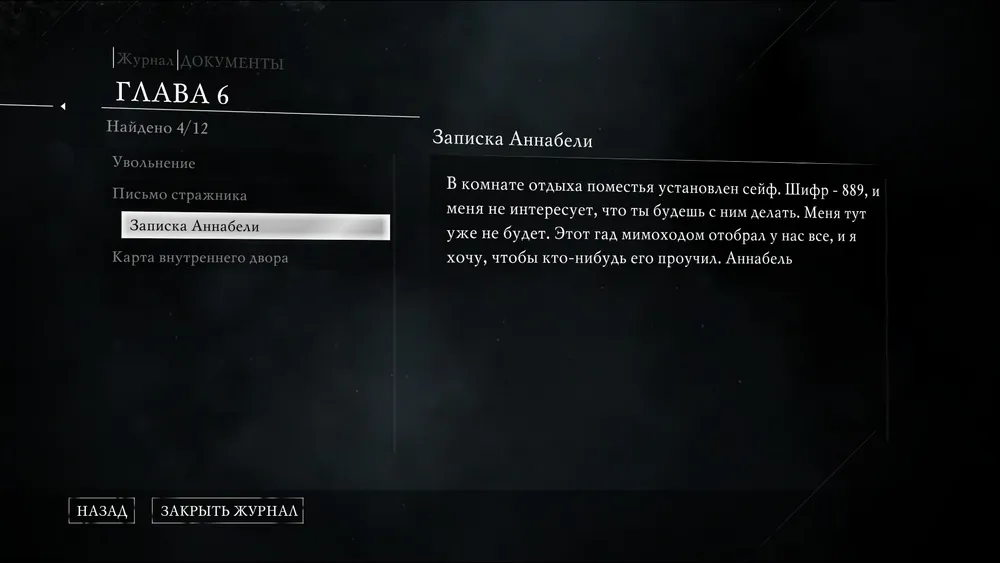Из записки узнаем код - 889. Теперь отправляемся в комнату отдыха, попасть в которую можно либо через дверь (комната имеет два входа), либо через вентиляционное отверстие из соседней кладовки. Сейф находится в темном углу напротив двери, в которой крутится стражник. Пробираться к сейфу сподручнее всего прячась за спинками дивана и кресла.
