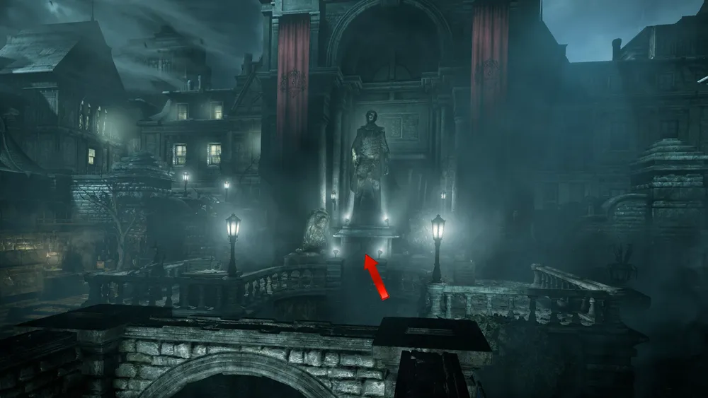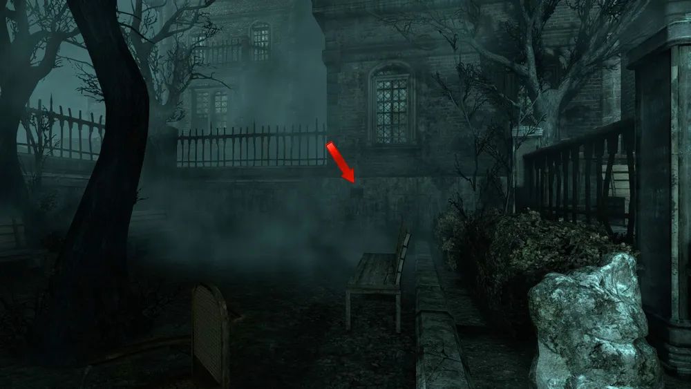 Прямо перед статуей протекает искусственный ручей - подойти к изваянию хозяина дома, не хлюпая и не шумя, проблематично. Если предпочитаете агрессивный стиль игры, то, подбираясь к табличке, заранее обезвредьте двух стражников, патрулирующих пространство справа от статуи. Если заинтересованы в стелсе, то перед тем, как лезть за мемориальной доской, отключите воду в парковых ручьях. Вентили, перекрывающие воду, находятся в техническом помещении под изваянием (см. карту локации).