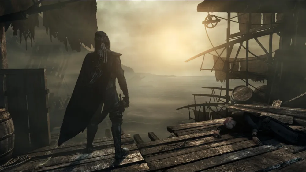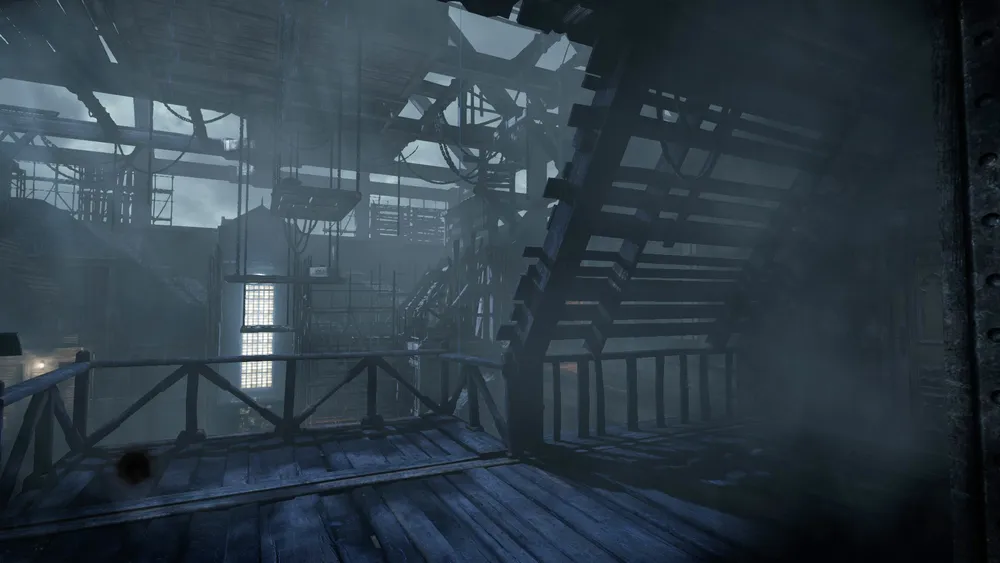 Оглядимся и заметим висящий над пропастью мост, а также вентиль уровнем ниже от того места, где стоит Гаррет. Нам к вентилю.
