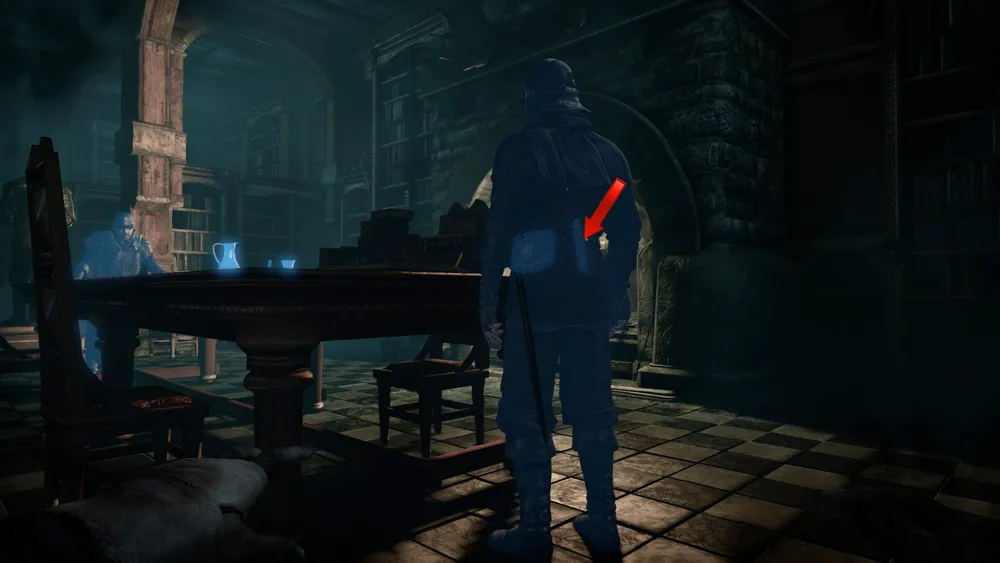 Сейф, естественно, заперт. Посему первым делом Гаррету потребуется разузнать код от него. Код содержится в записке, который носит на поясе один из стражников, патрулирующих библиотеку. Это один из двух стражников, которые не отходят от стола. При этом нужный нам непись все же не стоит неподвижно, а передвигается. Зона стола освещена, но покрасть документ таки можно. Надо лишь улучить момент, когда дядька с документом остановится у торца стола, повернувшись спиной к длинной тени, доходящей почти до стола же. Если к тому же и патрулирующий зону тени другой стражник отойдет подальше, то знайте, момент действовать настал. И не мешкайте, времени в обрез. Выжидать удачный момент советую сидя на книжном шкафу: хороший обзор и незаметность в одном флаконе. И после покражи лучше ретироваться туда же.