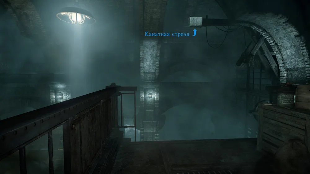 Оказавшись в лаборатории, отправляемся в дальний ее конец (за загадочной установкой, в которую заключен осколок камня Примали). Впереди над пустотой торчит балка, куда можно пристрелиться канатной стрелой.