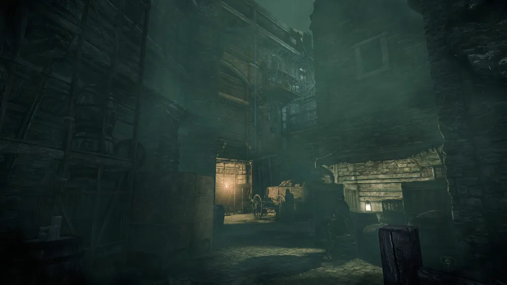 Итак, задача Гаррета - очутиться подле висящей под потолком впереди и справа деревянной клетки. В принципе, ничего в этом сложного нет. Отстреливаемся канатной стрелой, перемахиваем через перила балкончика и залезаем на конструкцию слева, с которой немудрено дотянуться до ближайшего каната. Затем перебираемся с одного каната на другой и спрыгиваем на решетчатый мостик над тюремным "двориком". Внизу урчат уродцы, а Гарретт хладнокровно забирает добычу из деревянной клетки.