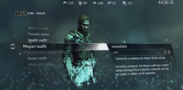 Костюм Майя выглядит очень круто, а также защищает от пуль. Враг может по вам промахнуться или пуля может пролететь мимо вашего лица и попасть в недруга за вашей спиной. Чтобы открыть этот костюм вам нужно найти 16 стел Майя и решить там головоломки. Об этом вы узнаете в 4 последовательности. После всех махинаций плывите в Тулум, вставляйте камни Майя в отверстия и забирайте костюм.