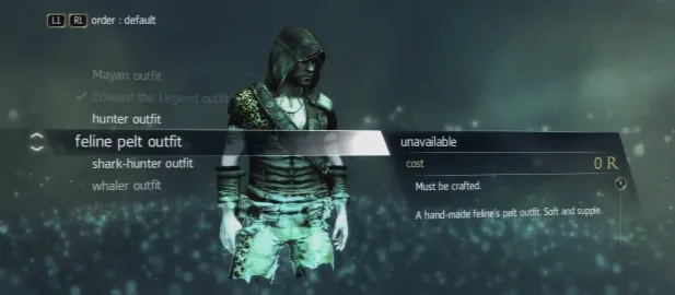 Опять же прибегаем к системе крафта и охоте. Добываем шкуру оцелота и ягуара, а после этого делаем себе костюм.