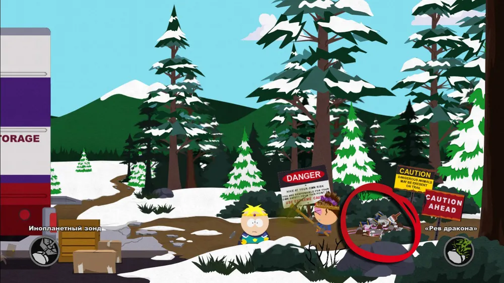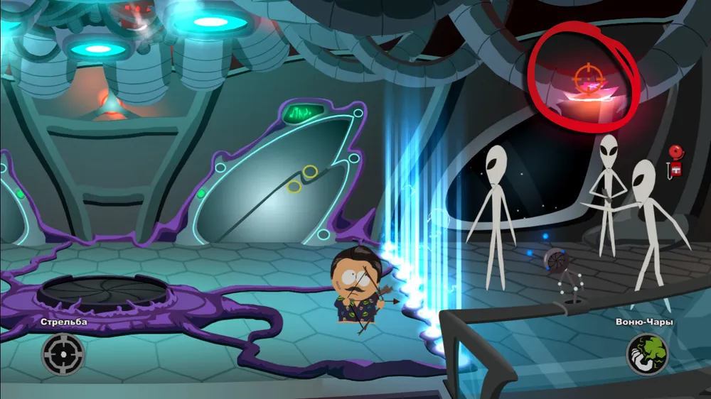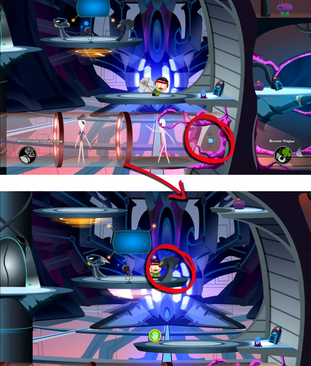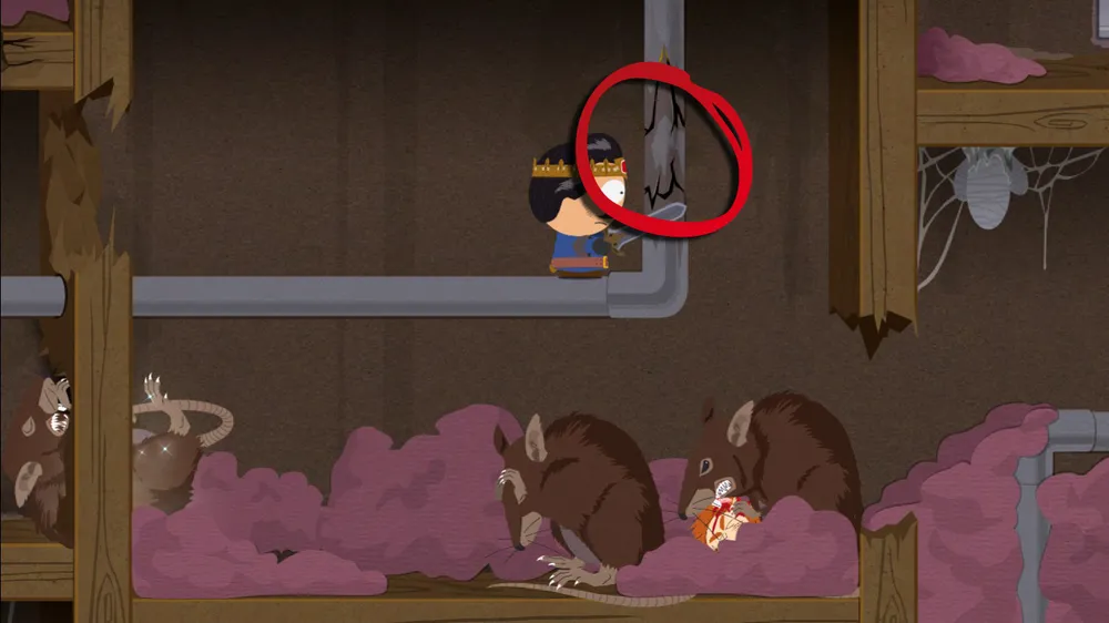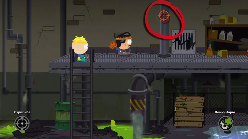 Стен попросит о помощи (вы его найдете в верхнем левом углу), он бросит лампу, стрельните в нее, а потом пукните. На другой стороне вас ждет Айк, используйте Нагасаки, чтобы помочь ему войти, и примените Воню-Чары на воспламенившемся механизме.