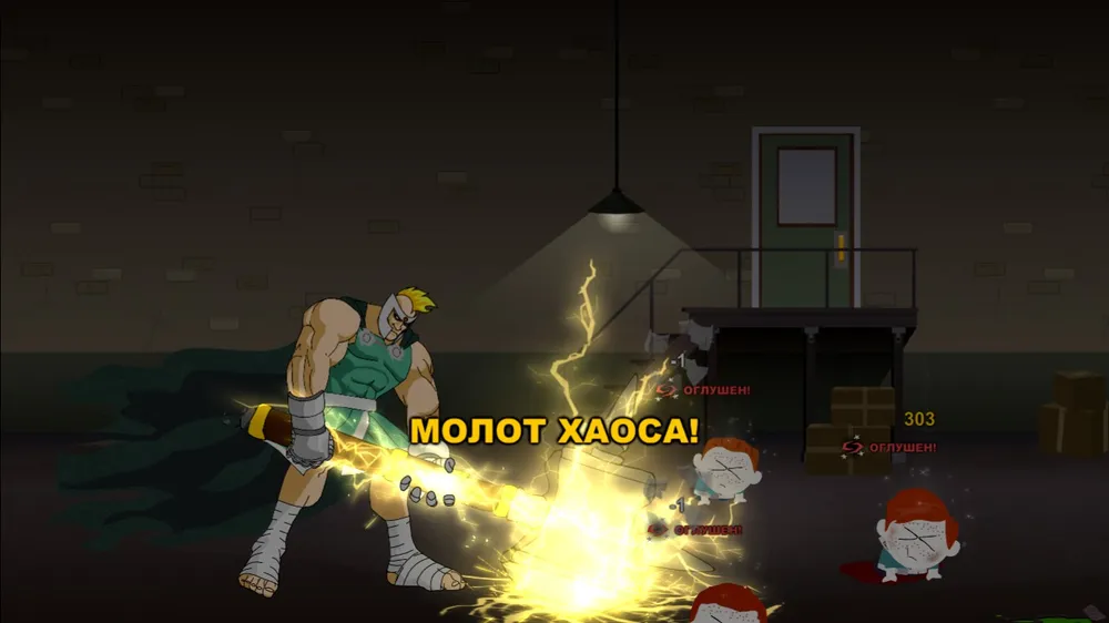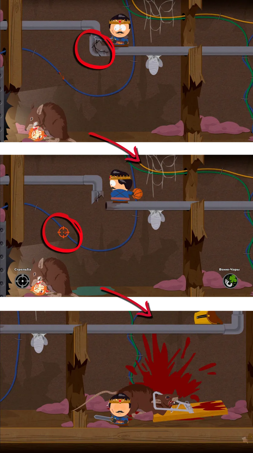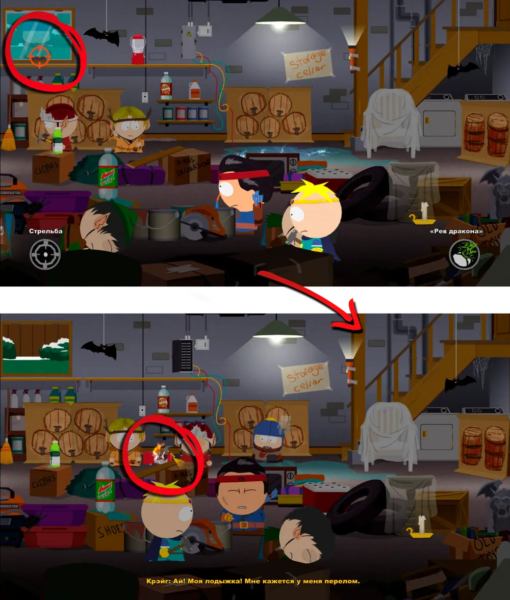 Используйте Воню-Чары, чтобы преодолеть заграждение. В окне появится Крэйг, выстрелите в защелку и откройте окно. Крйэг уронит лампу. Подождите, пока к ней не подойдет второй эльф, после чего используйте на лампе Воню-Чары. Сверху появится летучая мышь. Выстрелите в нее из лука. Последний эльф испугается, и его можно будет добить одним лишь выстрелом. Теперь идите к Крэйгу и используйте на нем способность Баттерса. Выходите из подвала. Из кухни доносятся стоны Картмана, идите туда и помогите ему.