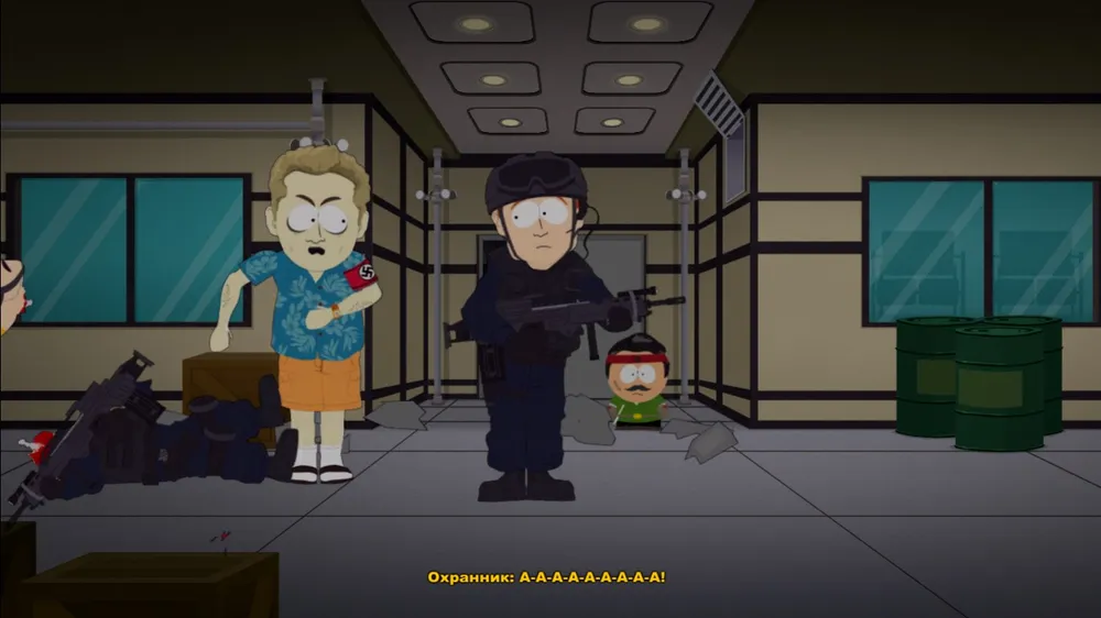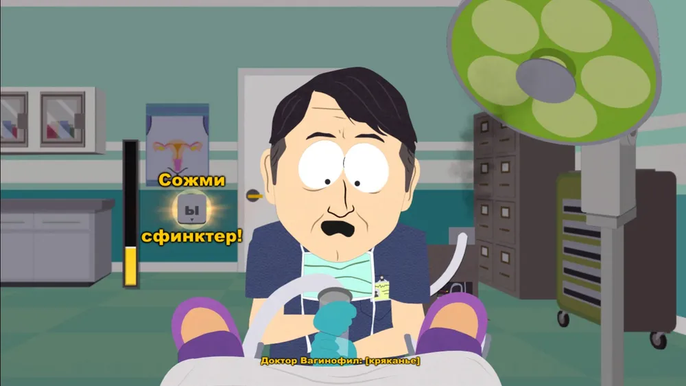 Повторите то же самое с гномами-нацистами. Идите дальше, сломайте провод, используйте пуки на огне, подымайтесь на верх. Вы попадете в операционную, где будет лежать переодетый в бабу Ренди. Делайте ему аборт, чтобы доказать агентам, что вы - настоящий доктор. Выходите из операционной. Проходите влево и стрельните в решетку над мышами.