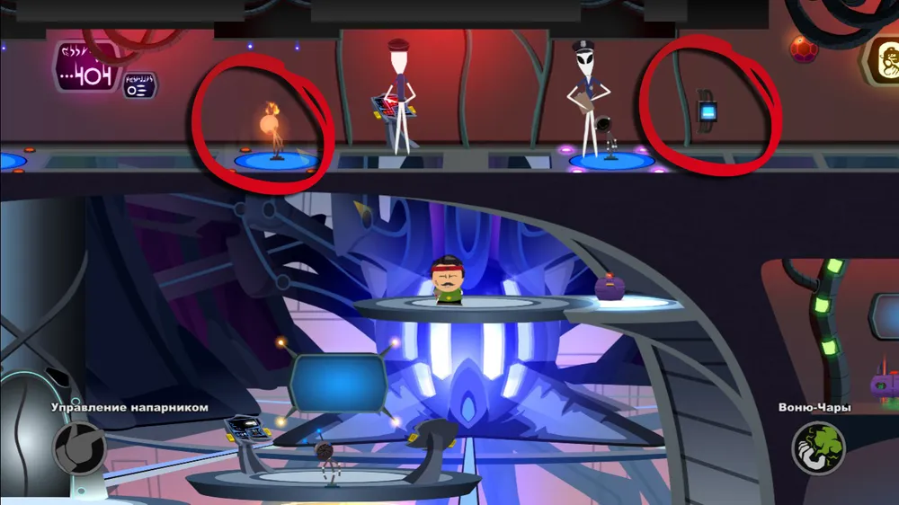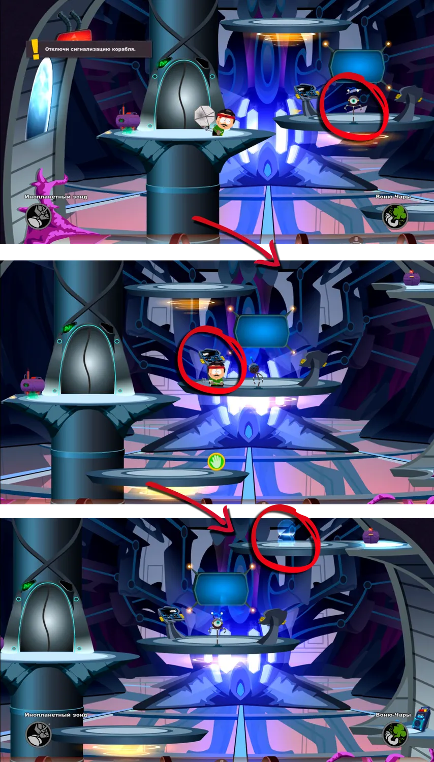 Используя зонд, нейтрализуйте второго пришельца, когда он подойдет к нерабочему телепорту. Вернитесь на платформу ниже и снова активируйте левую крнсоль, верхняя платформа сдвинется. Забирайтесь на самый верхний уровень (где ходит пришелец) и используйте Воню-Чары на сгоревшем телепорте (он выделяется оранжевой окраской). Враг нейтрализован. Активируйте консоль, которая находится правее сгоревшего телепорта, и проходите влево. Воспользуйтесь консолью и нажмите нужные кнопки (они будут мигать, а вы должны нажать их в правильном порядке).
