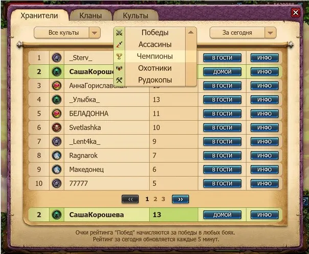 Я кратко расскажу о рейтингах хранителей и культов. Вам необходимо зайти во вкладку "Рейтинг"