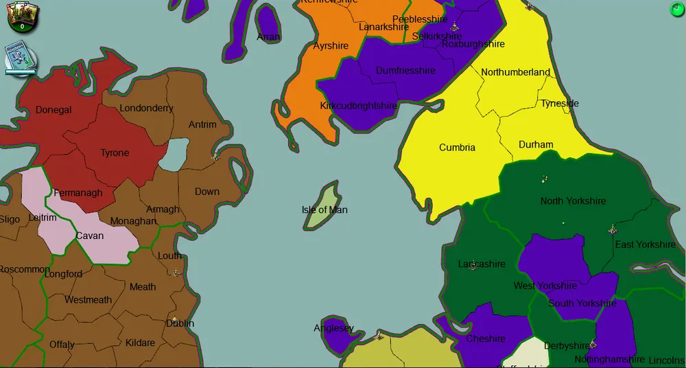 далее свободный округ, в котором будет цвести ваш мирок, не волнуйтесь, округ можно менять не ограниченное количество раз с помощью функции Settings->Abandon Current Village, также, там вы можете дать деревне имя и даже изменить внешний вид вашего персонажа (его будут видеть другие игроки при выделении вашей деревни), существуют как женские персонажи так и мужские, но на самом деле персонаж не играет ни какой роли. Вернемся к округам, рассматривая карту в отдалении можно увидеть что она окрашена в разные цвета, каждый округ имеет свой цвет, цвет хауса в котором состоят кланы этого округа (хаус это как альянс, в котором собраны различные кланы, клан = faction, альянс = house, всего хаусов 20), но если вы новичок для вас это не играет ни какой роли, многие стремятся ближе к Лондону, но лично я выбрал северный Йоркшир, по слухам именно там играет большинство русских, вообще выбор округа дело не сложное, особых преимуществ у определенных округов нет, хотя самый сильный хаус (а на сегодня это хаус 19, синий) занимает в основном северные территории.