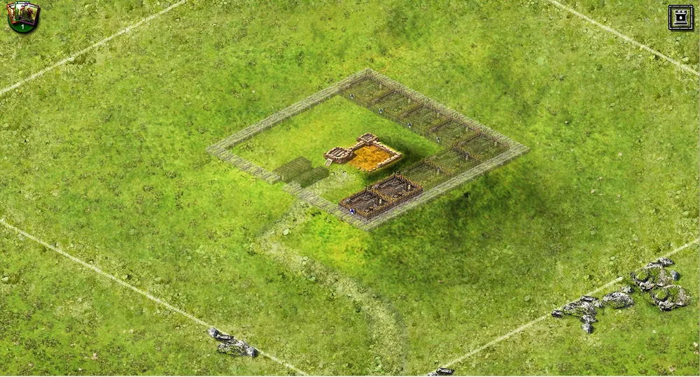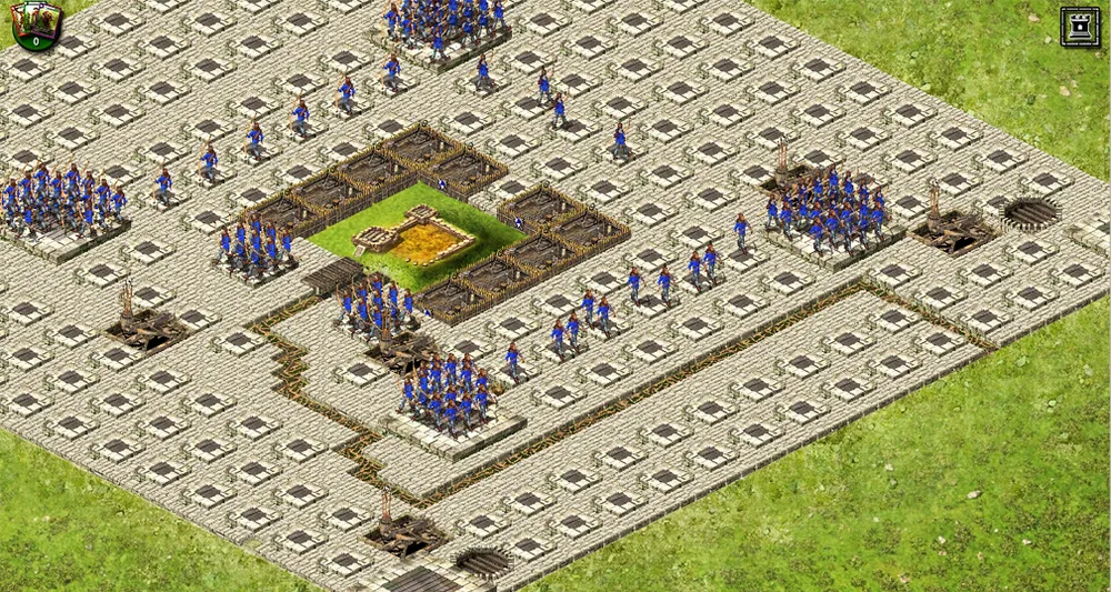 Как оборонять замок выбирает каждый сам, но лично я предпочитаю "масить" камень, много камня, много башен, это довольно эффективно, обычно AI не обращают внимания на башни, к тому же они обладают большим запасом прочности, в отличии от обыкновенной каменной стены, к входу (вход нельзя закрывать) удобно подвести тропинку (желательно более запутанную), по ней будут идти милишники врага, по всей длине этой тропинки строим ловушки (они стоят 100 железа), 1 ловушка действует в 1ом бою 1 раз, ее никогда не уничтожают (по крайней мере у меня их не разу не уничтожали), ловушка наносит приличный дамаг по любым юнитам, на башни ставим много лучников, и не с самого края, а желательно в середине (как на скрине, примерно), обязательно на помощь лучникам должны стоять турели и балисты, так же существуют такие виды протекции как рвы (бывают водяные и нефтяные) и котлы с маслом (очень эффективны, сбрасываются на голову врагу подошедшему близко, имеют неплохой радиус действия). Конечно каждый должен выбрать сам как ему удобнее защищать, но если вы колеблетесь попробуйте сделать как я.