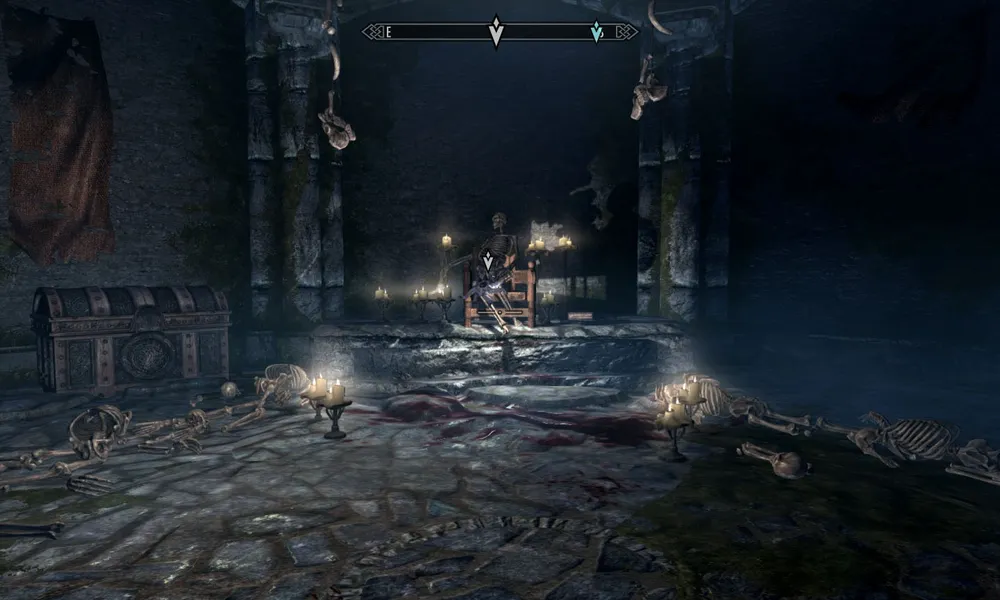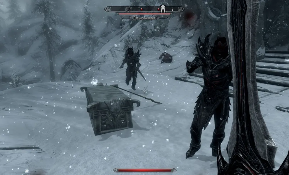Эти дреморы – носители искомых сердец. Снимаем с одного ключ, заходим внутрь святилища. Там еще два дремора… Veni Vidi Vici! Итого – 4 сердца, и одно с Драскулы. Так же в этом святилище есть и эбонитовые слитки (в сундуке слева). Они тоже понадобятся, берем.