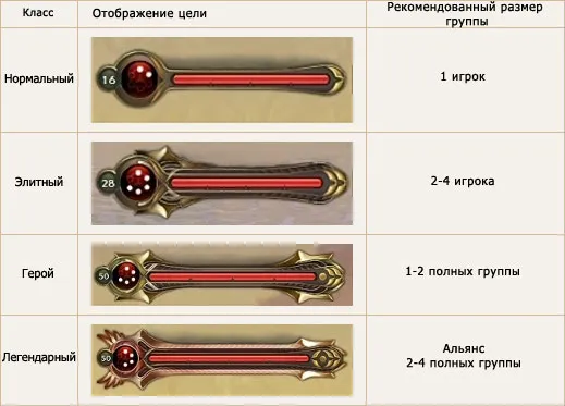 Монстры в Айон, в отличие от многих ММОРПГ, весьма сильны и для того чтобы их убивать, зачастую, нужна целая группа игроков. Как выглядит таргет-бар монстра, каков его класс и сколько потребуется игроков для уничтожения злобного NPC вы можете увидеть в таблице ниже.