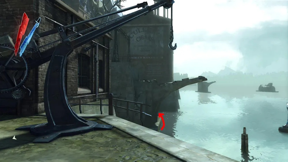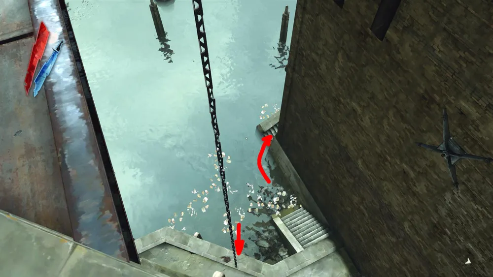 По цепи крана спускаемся вниз. Далее придется искупаться или использовать Перенос, чтобы попасть на крыльцо нужного дома.
