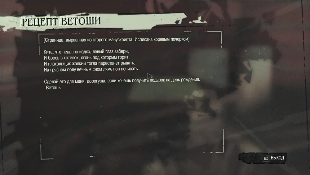 Листочек с рецептом находится в комнате с красными стенами на третьем этаже здания, непосредственно примыкающего слева к воротам на территорию вокруг китобойни. Попасть туда можно только через окно.