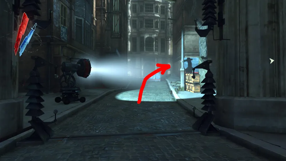 Проходим через ворота со стеной света, идем прямо по улице (или по карнизам и крышам стоящих вдоль нее домов) до ее пересечения с другой улицей и поворачиваем направо.