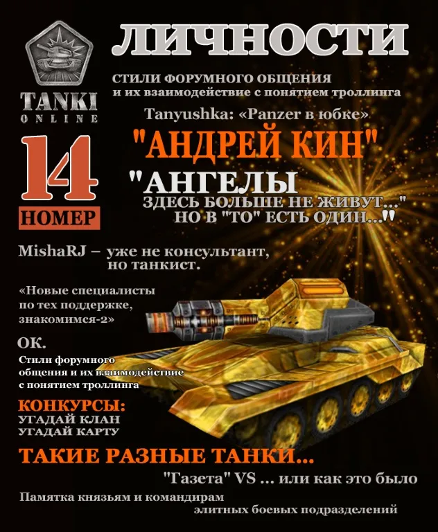 Чем заняться, пока остовы вражеских танков догорают под стенами крепости, а новая волна налётчиков ещё не накатила? Конечно же, почитать газету «Танков Онлайн»! Кто, как не наши замечательные корреспонденты, познакомит вас с очаровательной танкисткой CHbI-AHrEJlA, расскажет о стилях форумного общения, развлечёт конкурсами… Перечислять достоинства свежего выпуска «Газеты» можно долго, но лучше один раз увидеть.