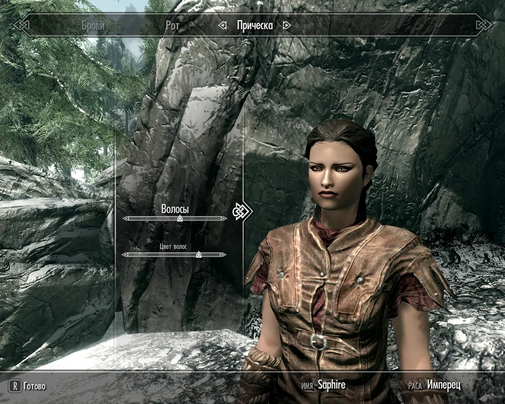 Имя моей дикой имперочки - Saphire, мужское правда, но оно как мне кажется отражает характер героини. Девушка прибыла из Сиродила в Скайрим потеряв родных и близких в войне с эльфами. Её манят бескрайние лесные дебри Скайрима,где можно собирать нужные травы и вдали от посторонних глаз совершенствовать искусство колдовства.