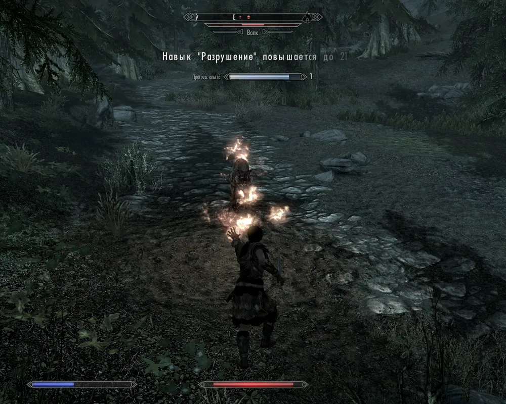 Аккуратно пробираемся по тропинке не обращая внимание на координаты цели главного квеста в Ривервуде, по пути всё таки не встречается опасных противников.Железный меч + пламя жарят и нарубают волков как китайский повар в ресторане.