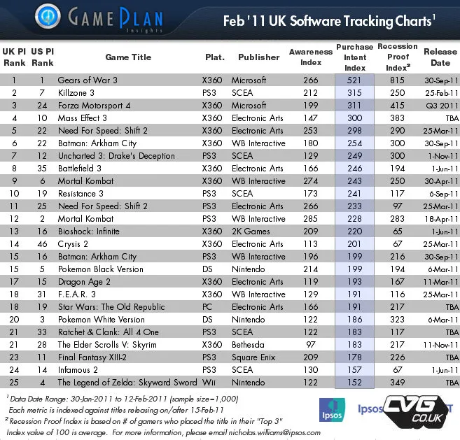 Компания выпустила рейтинг самых ожидаемых игр в Штатах и Великобритании. Что характерно, Gears of War 3 побил всех в обеих странах.