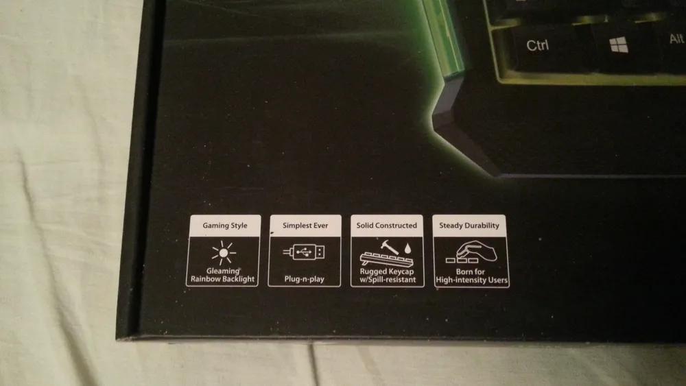 Упакована клавиатура в обычную картонную коробку. Картон достаточно прочный и жёсткий, на лицевой стороне изображена сама клавиатура и пиктограммами отмечены её заявленные достоинств: подсветка, длительный срок эксплуатации, прочность и защита от влаги. С обратной стороны коробки приводятся технические сведения.