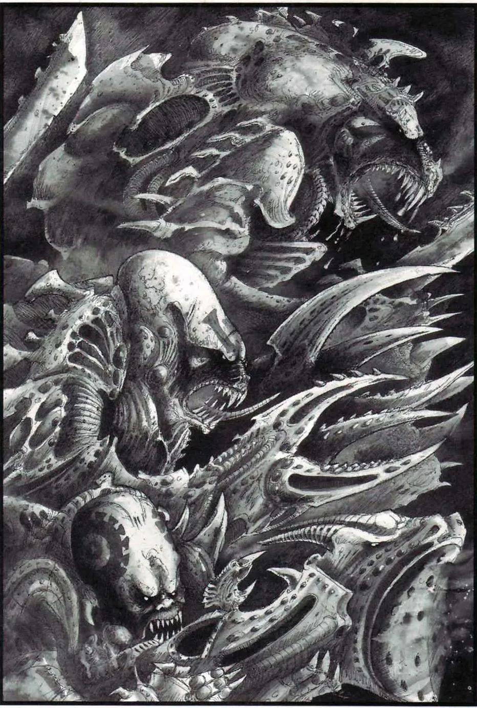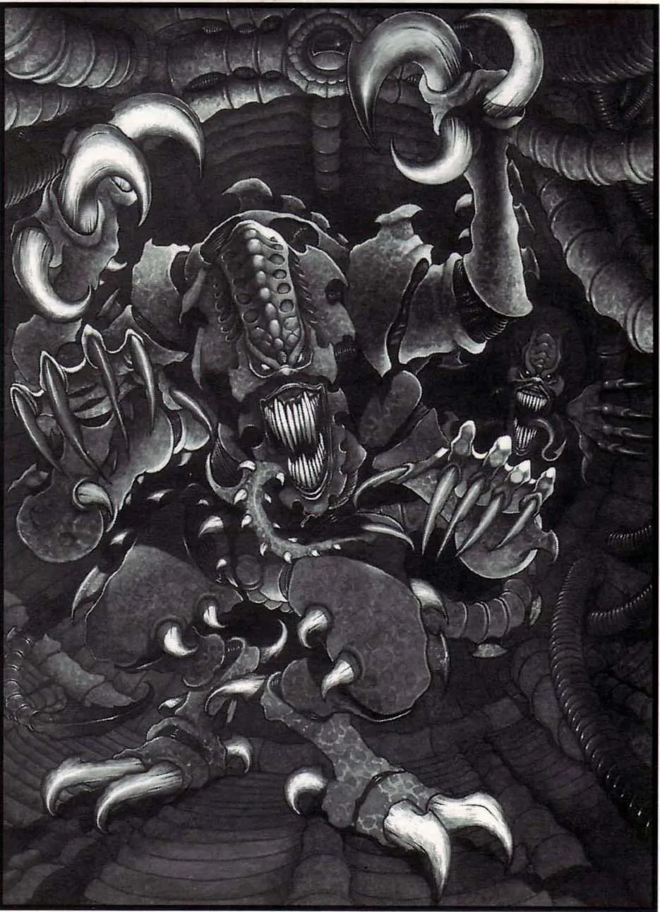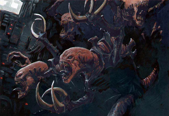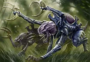 Начнём с самих генокрадов. На рисунке — типичный представитель вида. У генокрадов шесть конечностей: одна пара когтистых нижних и две пары верхних, одна с тремя-четырьмя когтями (зависит от ДНК конкретной особи) и одна с пальцами/когтями/чем угодно (также зависит от ДНК). Генокрады крайне быстры и ловки, а их когти способны вскрыть даже силовой доспех космодесантника. Стрелковым оружием не обладают и пользоваться не умеют, несмотря на развитый мозг, при контакте с противником стремятся как можно скорее перейти в рукопашную. В ближнем бою способны убить терминатора, особенно если их несколько. Часто нападают из засады и с необычных векторов (сбоку, сверху, снизу, сзади). Одиночные особи встречаются крайне редко, обычно генокрадов целый выводок, насчитывающий несколько десятков особей. В пределах выводка генокрады обладают телепатической связью сродни использующейся расой тиранидов в целом. Несколько выводков также могут объединяться в сеть, что позволяет повелителю выводка с легкостью оперировать всеми особями для наибольшего тактического эффекта. Предпочитают замкнутые пространства (коридоры, туннели, системы канализации и вентиляции, космические корабли).