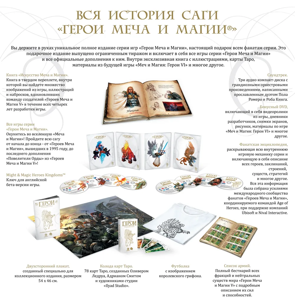 Летом 2008 компания 1С приобрелаБуку. Вполне возможно, выход коллекционки состоялся бы и без этого союза, но для полноты картины упомяну этот факт. Так как уже 18 ноября 2008на сайте Буки появилась страничка “Полного Издания”. На ней было описано содержимое издания (включая карты таро и прочее) и анонсирована дата релиза – 12 февраля 2009. Буквально через два дня страничку убрали, но для игроков этой утечки было достаточно, чтобы верить и ждать. 12 февраля прошло без новостей, и следующее упоминание датируется 21 апреля 2009. В этот день на сайте издателя появилась пафосная новость, что все игры серии “Герои Меча и Магии” теперь будут издаваться под знаком Буки. “А в конце года компания преподнесёт своим покупателям грандиозный подарок!” И игроки уже знали, что это будет.