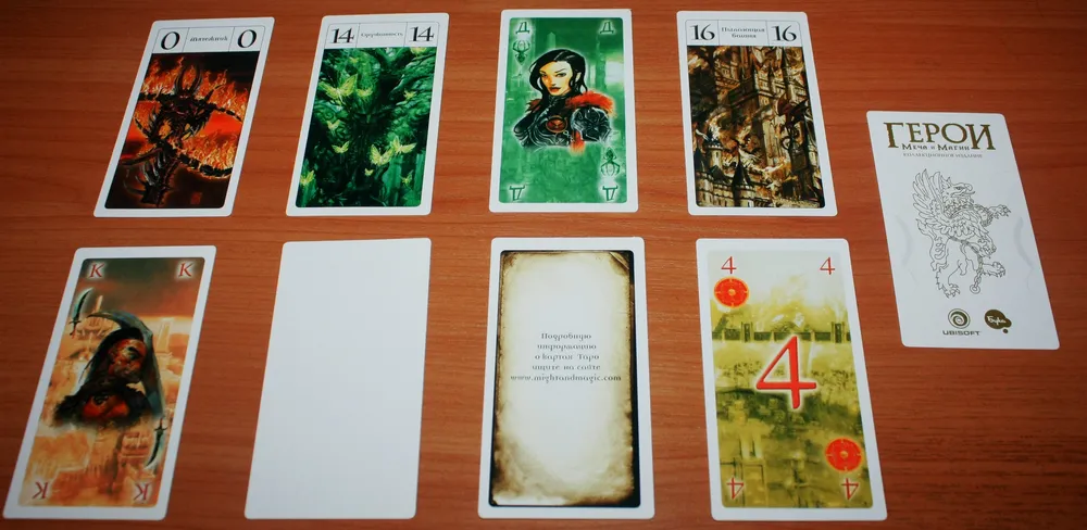 В первую очередь пересчитал карты – их оказалось 80 штук. Полная колода состоит 78 штук, а значит должно быть еще две пасхалки. Первая – референс-карта со ссылкой на http://mightandmagic.com (ничего про колоду я там не обнаружил за давностью лет), вторая – чистая, но с рубашкой. Видимо, запасная карта на случай потери одной из основных. Могли бы для России положить таких побольше :) Всю колоду фотографировать не стал, вот несколько примеров (справа – пример рубашки):
