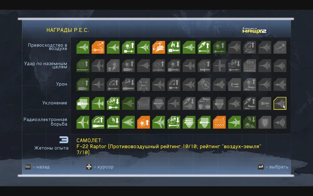 Зато разработчики полностью переработали систему уровней. Раньше мы получали новые самолеты, теперь же мы получаем «жетоны», которые тратим на открытие активных/пассивных способностей, умений, действующих на группу, новых самолетов. Есть пять веток, в каждой свои самолеты и способности определенной направленности. Для открытия каждой следующей награды необходимо наличие всех предыдущих.