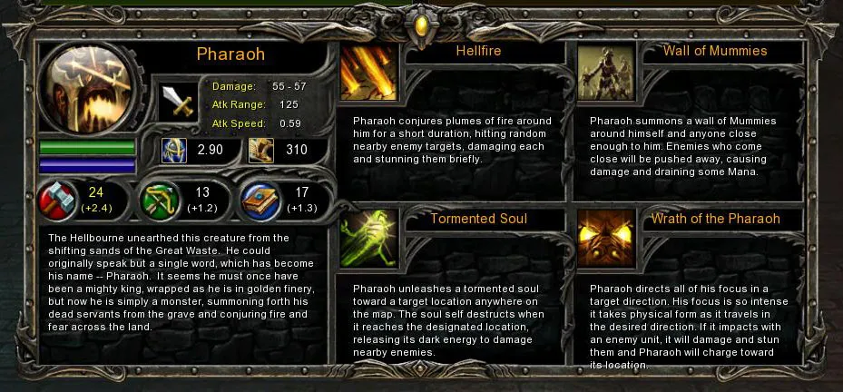 Фараон призывает верных слуг. Мумии встают из под земли, образуя вокруг хозяина ровный круг который не дает врагам пройти. Прикосновение к стене снаружи откидывает противника, наносит урон и сжигает немного маны. Каждая мумия может оттолкнуть только один раз. Чтобы уничтожить ячейку стены — нужно сделать три удара, а хозяин загоняет мумию обратно всего с одного.